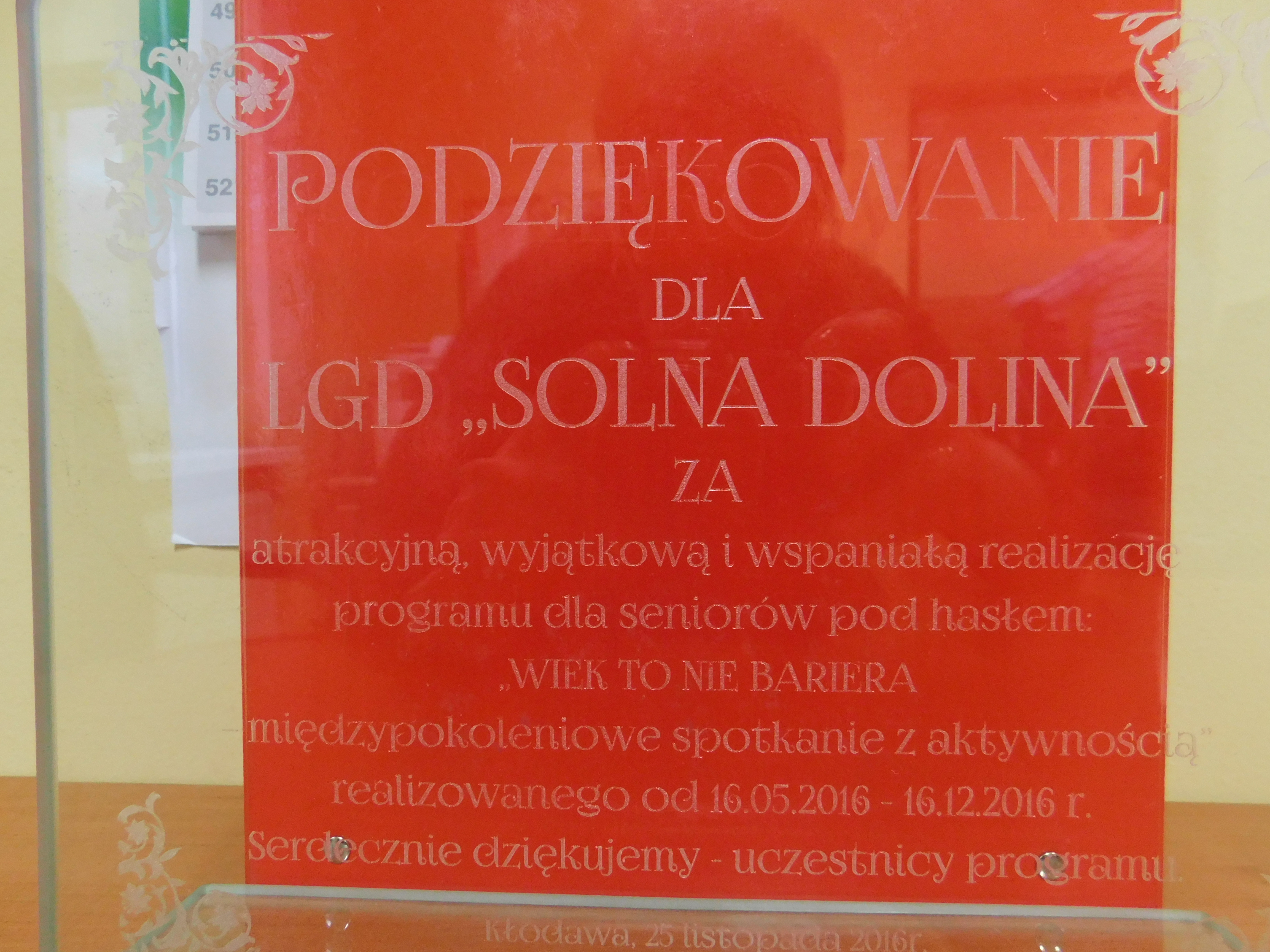 „Podziękowanie dla LGD „Solna Dolina” za atrakcyjną, wyjątkową i wspaniałą realizację programu dla seniorów „Wiek to nie bariera – międzypokoleniowe spotkania z aktywnością” realizowanego od 16.05.2016 roku do 16.12.2016 roku.